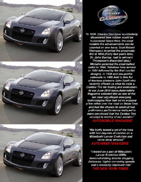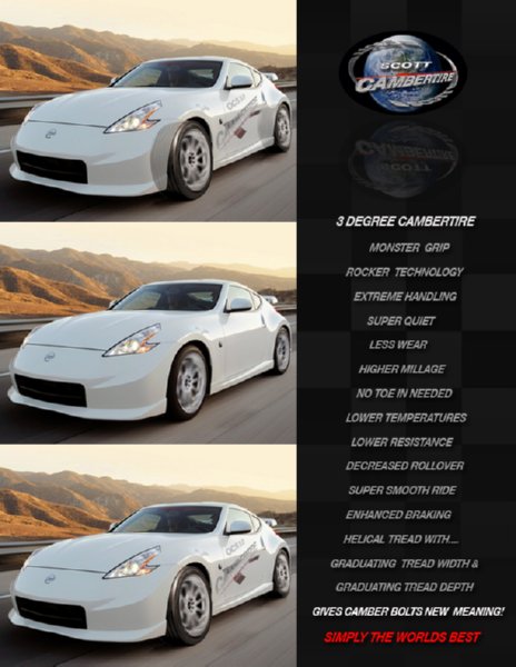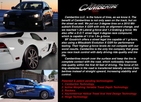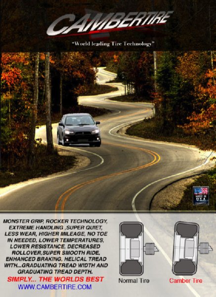 At Cambertire, our initial focus was in the high performance area with our 2°, 3° and 4° tires, as these vehicles loan themselves to repeatable test results. The attributes however, benefit far beyond the race track. The list of applications IS endless, but here are a few to consider: Minivan, hybrid, pickup trucks, SUVs, Jeeps, military vehicles, semi trucks and trailers, fifth wheels, horse trailers, ATVs, lawn mowers, tractors, large mining trucks etc...
